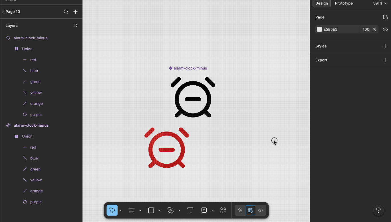 Notice how when I grab an instance of that <span class="figma-component">alarm-clock-minus</span> icon and override the color, I'm applying that override to the shape-building layer. It doesn't matter at all what colors the individual paths inside have.