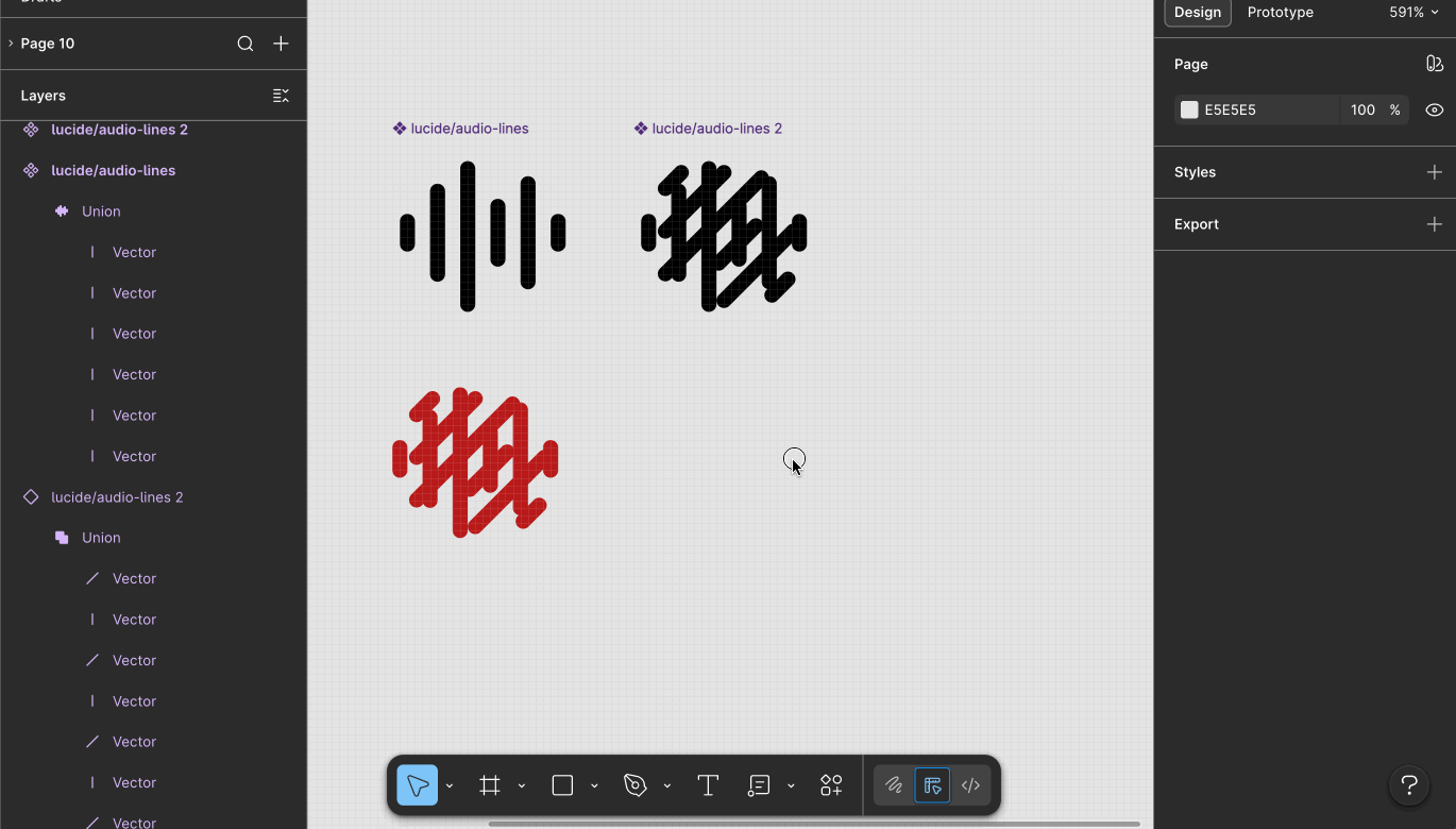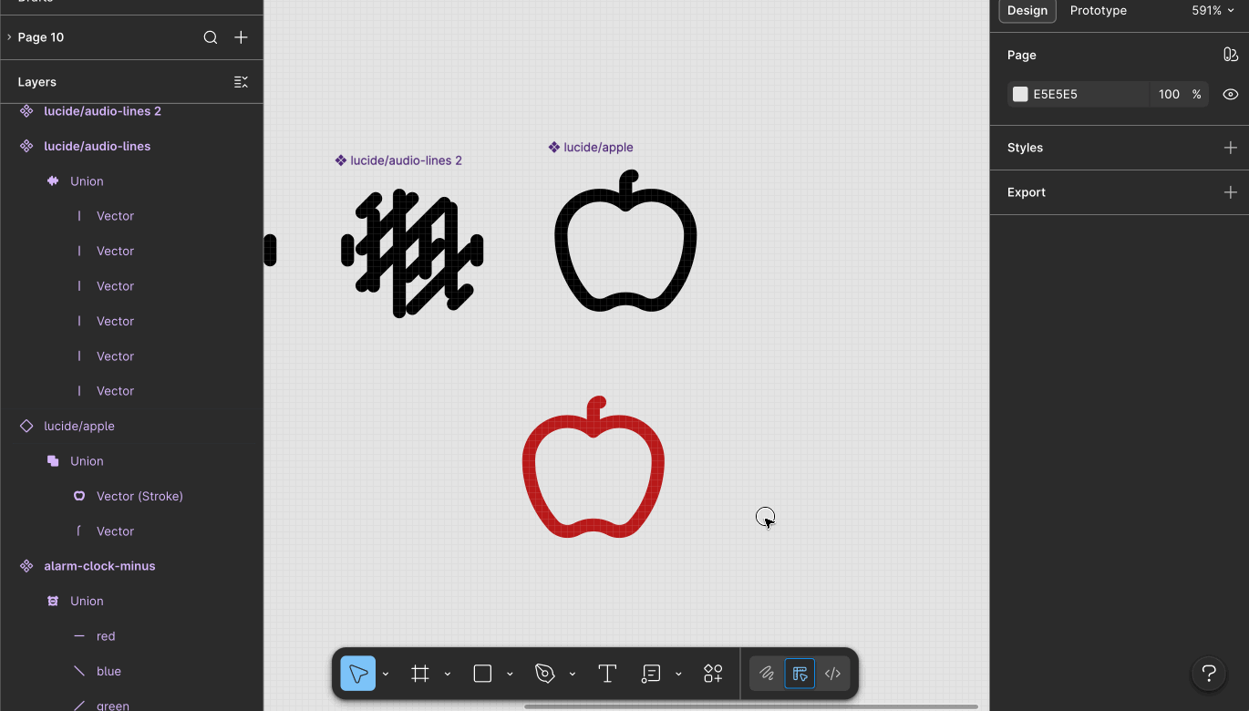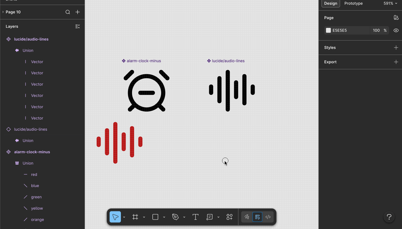 Did you notice that the layer names are different? <span class="figma-component">audio-lines</span> underlying layers were all named "Vector", but the ones in <span class="figma-component">alarm-clock-minus</span> were named "red", "blue", "green", etc. Now that isn't to say layer names aren't important—they are—but not the layers nested inside the shape-building layer. You can name those anything. It's the shape-building layer where naming matters.